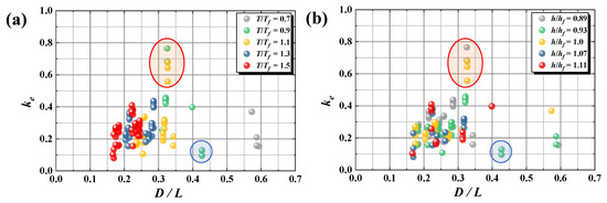 Relationship between ke and D/L depending on (a) T/Tf, and (b) h/hf. Open red and blue circles denote the range of high and low ke, respectively, owing to the effects of D/L.