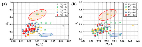 Relationship between ke and Hi/L depending on (a) T/Tf, and (b) h/hf.
