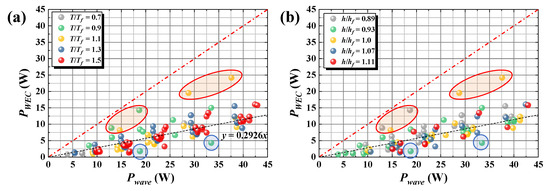 Relationship between Pwave and PWEC depending on (a) T/Tf, and (b) h/hf. Open red and blue circles denote the ranges of high and low ke.