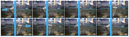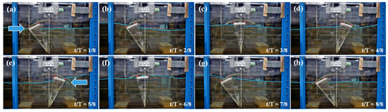 Screenshots of the flap motions for the case of D = 1.09 m, h = 0.525 m, T = 2.2 s, and Hi = 0.12 m at (a) t/T = 1/8 to (h) 8/8. D/L is 0.2355 and ke = 0.18. The blue arrow denotes the wave direction acting on the flap, and the white dotted line indicates the rotational neutral axis of the flap. The blue solid line denotes the water surface.