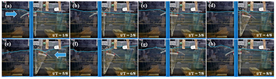 Screenshots of the flap motions for the case of D = 1.45 m, h = 0.425 m, T = 2.6 s, and Hi = 0.12 m at (a) t/T = 1/8 to (h) 8/8. D/L is 0.2852 and ke = 0.44. The blue arrow denotes the wave direction acting on the flap, and the white dotted line indicates the rotational neutral axis of the flap. The blue solid line denotes the water surface.