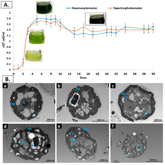 Representative ultrastructure of TEM images are also presented in Figure 1B. The images revealed different cell sections with a detailed morphology and localisation of each intracellular cell organelles. The round-shaped images resulted from a section across the width, while the oval-like images represent a section across the length []. The sheet-like thylakoid membranes (TM) are the main component of the chloroplast, the organelle that occupies two-thirds of the cells grown under standard conditions, which is clear in Figure 1Bb, where chloroplasts occupy a significant part of the cell volume. The eyespot, as it appears in Figure 1Bc, is attached to the inner plastid membrane. In cells grown in nutrients replete media to stationary phase (Figure 1Ba–c), all the cell organelles are observable in different sections. In addition, few starch granules were detected at the stationary phase, while no lipid bodies were identified. Conversely, both storage entities (starch granules and lipid bodies) are abundant at 30-days old cells, while TM are less noticeable (Figure 1Bd–f). It is well established that lipid accumulation as TAG in microalgae increases as the cells age, and generally as a result of nutrient consumption during the stationary growth and is accompanied by a cessation in cell division [].
