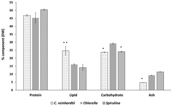 Macronutrient content of Chlamydomonas reinhardtii, Spirulina and Chlorella on dry weight (DW) basis. Results are the means of triplicate determinations ± SD. Values with two asterisks (**) are significantly higher within the same component and those with one asterisk (*) are significantly lower within the same component at (p ≤ 0.05) using Tukey’s test. Carbohydrate content was calculated by difference: Carbohydrate = 100−(Protein + Lipid + Ash).
