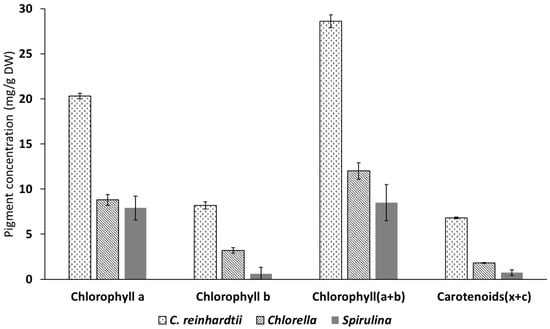 The ash content of the three microalgae species in this study varied significantly. Ash content in microalgae is directly correlated with the concentration of inorganic compounds and salts in the water environment, where the microalgae were grown []. On a dry weight basis, C. reinhardtii exhibited the lowest ash content (4.8%), followed by Chlorella (9.3%) and Spirulina (11.4%). The three values are well situated within the wide range of 8–40% ash content observed in microalgae []. The ash contents of the three species were lower than the maximum value allowed in algal products sold in the USA (45% DW), and were comparable with that of land vegetables, ranging between 5–10% DW []. The lower ash content in C. reinhardtii may help to explain its relatively high content of lipids and pigments (chlorophyll and carotenoids) compared with the commercial species Chlorella and Spirulina.