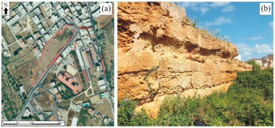 Representative samples of a coarse-grained calcarenite were chosen for this study. Calcarenite samples were taken from the Guttadauro quarry front located in Via Cotogni, Aspra village, Palermo (Figure 1a,b).