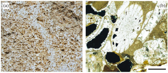 (a) Fresh cut surface of a representative specimen of Pietra d’Aspra (not consolidated and not weathered, sample PA-TQ); (b) thin-section microphotograph of the same sample (scale bar = 0.5 mm).