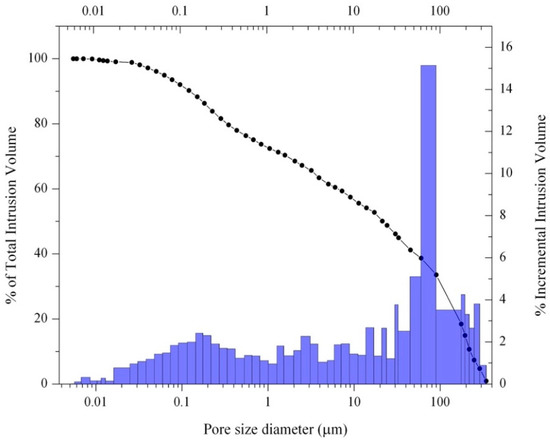Pore size distribution curve of a representative specimen of Pietra d’Aspra (not consolidated and not weathered, sample PA-TQ). Left y-axis = % of total intrusion volume (line); right y-axis = % of incremental intrusion volume (bars).