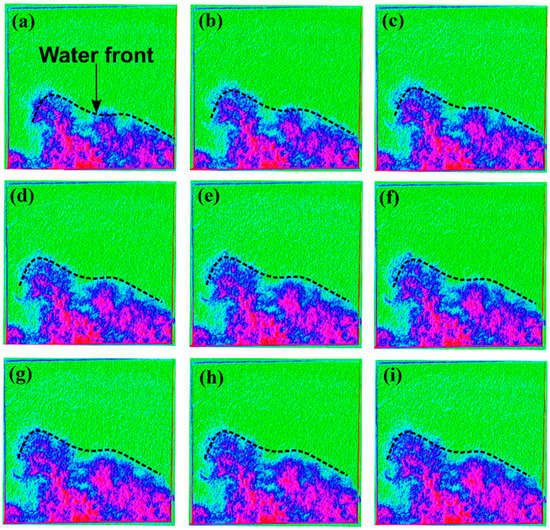 False-colored transmission images of water imbibition in PA1 sample at (a) 40 s, (b) 2560 s, (c) 3840 s, (d) 5120 s, (e) 6400 s, (f) 7680 s, (g) 8960 s, (h) 10,240 s, and (i) 11,560 s. In green, the 5 × 5 cm2 surface area of the limestone is displayed, whereas the blue/purple/red regions account for the liquid phase characterized by an ever-increasing amount of water. The quantitative evaluation of the water content is addressed from the analysis of the wetting profiles (see text for details).