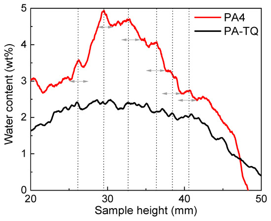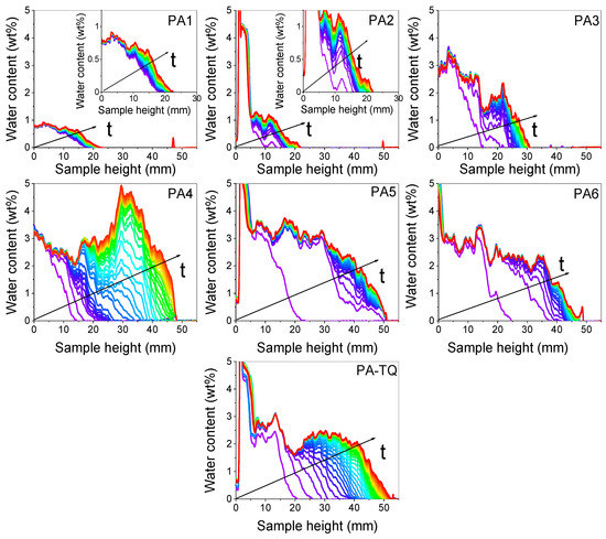 Water content profiles vs. sample height as obtained following the procedure described in Section 2.3. As already stated, neutron radiographs were collected every 40 s for all samples except for PA4, for which a time-step of 10 s was used. In our case, sample PA4 was measured for a total of 13,310 s, during which a water-saturated condition was achieved. For all the other samples, longer exposure times were necessary, since a slower water imbibition rate was observed after the initial stage of exposure with the water bath. For this reason, the water content profiles reported here were collected in the first ~13,310 s (3.7 h) of contact for comparison.