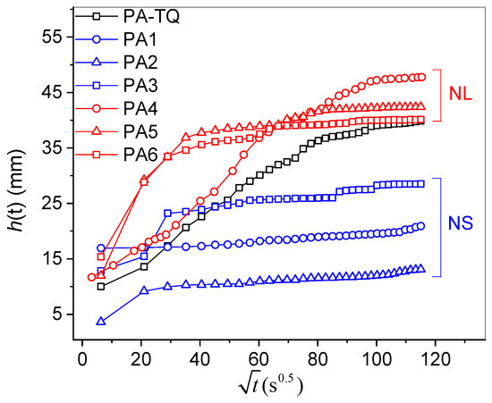 where K is a coefficient, known as sorptivity (m/s0.5), accounting for the tendency of a porous material to absorb/transmit liquid through natural imbibition. Generally, the L–W model assumes not only a complete saturation of the region behind the wetted front, but also a uniform pore size distribution of the material. Consequently, in materials characterized by a broad distribution of pores sizes, as in our case, deviation from the aforementioned model is often achieved. Nevertheless, by looking at the way in which the experimental values diverge from the expected ones, several considerations can still be made. In Figure 9, we report the vs. plot for all the investigated PA samples in the 0–13,310 s time range.