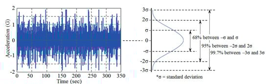 Because the vehicle speed and road pavement roughness vary throughout the journey, the vehicle vibration is non-stationary, in which statistical values such as the mean and root–mean–square acceleration (standard deviation; rms G or Grms) of the events are not maintained over time. The non-stationarity of vehicle vibration causes the non-Gaussian distribution of vehicle vibration events [4,5]. However, vibration signals measured in a vehicle are characterized such that their average values remain relatively constant even if the vibration values for a particular frequency in the signal continue to change. This characteristic enables the vibration test equipment to reproduce the vibration behavior of the vehicle in a laboratory [6]. Therefore, in the vibration analysis of the vehicle, the random vibration of the vehicle is a Gaussian distribution, and it is assumed that all measured events exist within three standard deviations (±3σ; Figure 1).