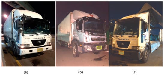 To analyze the vibration level for Korea’s truck transport environment, we selected three types of trucks, as shown in Figure 2, which are commonly used to transport palletized unit-loads in Korea: a leaf-spring (suspension) 5-ton (payload capacity) truck, an air-ride 5-ton truck, and a leaf-spring 11-ton truck [2]. In this study, the trucks were unloaded. All of the selected trucks were built in Korea; their detailed specifications are shown in Table 1.