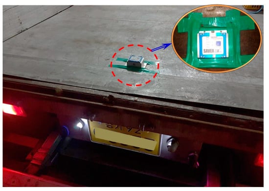 A data recorder (SAVER 3 × 90, Lansmont Corporation, Monterey, CA, USA) with built-in triaxial acceleration sensors was used to record the vibration signals in a traveling truck. The instrument was held securely by double-faced adhesive tape and blue tape at the center position at the rear end of the load platform of the truck, where the vibration level is relatively large [11,15,29,33] (Figure 3).