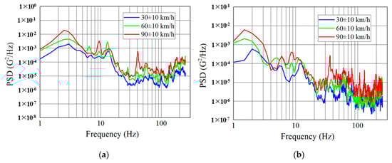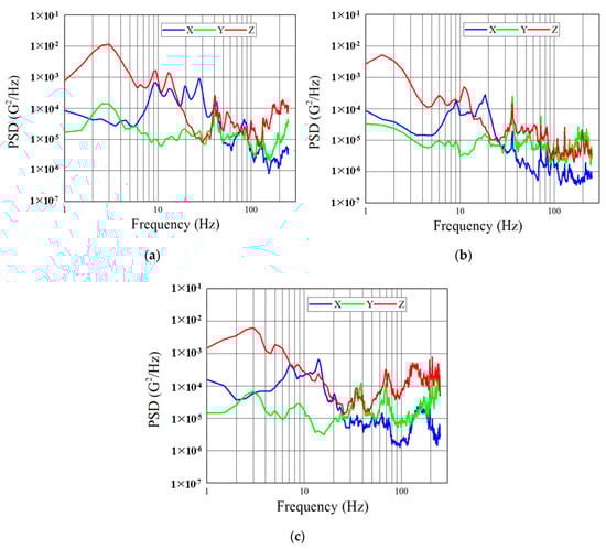 Figure 4 shows each PSD profiles for the tri-axial vibration records measured in three target trucks on the test route. As expected, the vibration levels were significantly higher in the vertical axis than in the lateral and longitudinal axes for all target tracks, and the change in the value of the longitudinal vibration level was smaller than that of the other two directions. In particular, the differences in directional vibration levels were more pronounced in the low-frequency range of 110 Hz. The vehicle’s overall rms G value at that frequency range was the largest in the vertical direction, followed by the lateral direction and the longitudinal direction (Table 3).