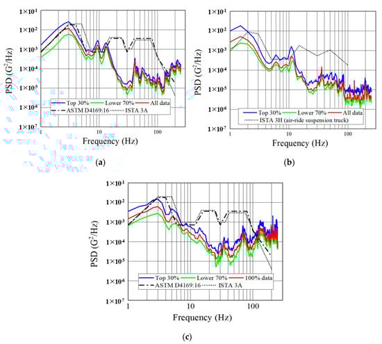 In the low-frequency range of 1–10 Hz, the shape and peak intensity and frequencies of the high-level PSD profile of leaf-spring truck, representing the top 30% of the data recorded, were roughly similar to those of ASTM D4169:16 (medium level) [26] and ISTA 3A (over-the-road trailer spectrum) [28]. However, they showed significant differences in the higher-frequency regions. The shape and peak intensity and frequencies of the high-level PSD profile of the air-ride truck were roughly similar to those of the ISTA 3H (air-ride suspension truck) [39], although significant differences were noted at the higher-frequency regions. The reason for the relatively substantial difference in these regions between the results of this study and the existing standardized test protocols is attributed mainly to the differences in test subjects and conditions [40]. In addition, the results of this study were measured in unload conditions for general trucks, and there are many sudden speed changes of trucks during transport and the characteristics of national roads and highways in Korea having many curved routes.