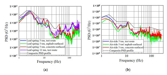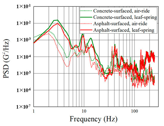 The overall shape of the PSD profile in the leaf-spring truck was higher in the low-frequency range of 1–10 Hz, lower in the medium-frequency range of 15–40 Hz, and again relatively higher in the high-frequency range of 40–250 Hz. However, in the case of the air-ride truck, the overall shape of the PSD profile was lower with increasing frequency. The shape of the PSD profile for the leaf-spring truck was similar to that reported by Zhou and Wang [13].