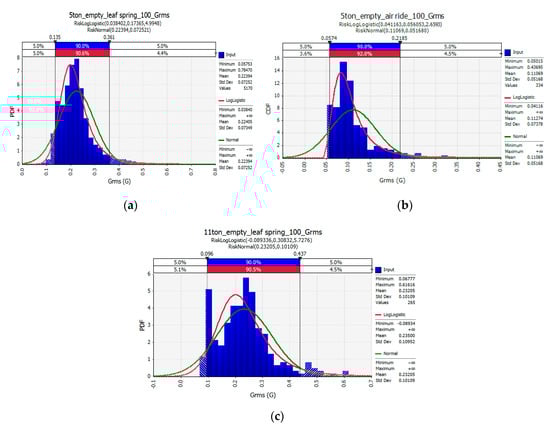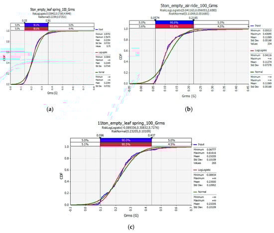 The kurtosis and skewness for this PDF were analyzed (Table 7). The kurtosis values for all recorded data were more significant than 3 for all trucks of this study, which indicates a heavy-tailed distribution; therefore, the vibration events measured in Korea’s truck transport environment do not follow a normal distribution [41]. However, the kurtosis for the lower 70% of data recorded was much closer to 3 and thus closer to normal distribution because the high-amplitude events included in the measured vibration signal, which exist outside normal distribution, were excluded. Figure 9 shows the CDF for each condition. These values coincide with the log-logistics calculated values in 90% of the experimental data under all experimental conditions, but show some differences from the normal distribution values.