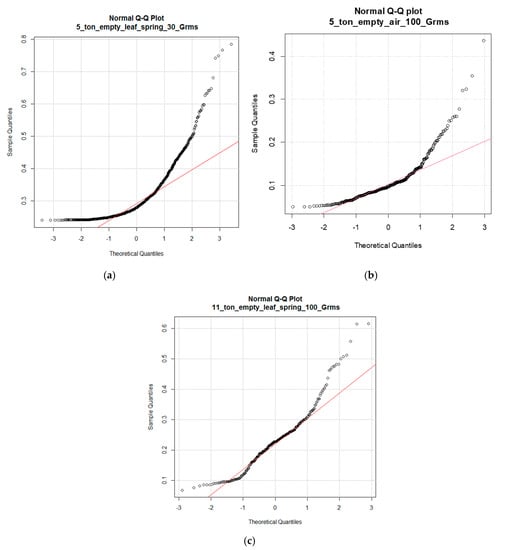 The heavy-tailed distribution characteristics of the vibration events measured in this study are also well illustrated by the normal quantile–quantile (Q-Q) analysis shown in Figure 10. The normal Q-Q plot provides a diagnostic check on whether the data originate from a normal distribution and involve a plot of empirical quantiles against the corresponding quantile of normal distribution. A straight-line relationship suggests that the data are normally distributed. Q-Q plots are displayed in a curved shape, indicating that the distribution is skewed or has heavier tails than those in a normal distribution.