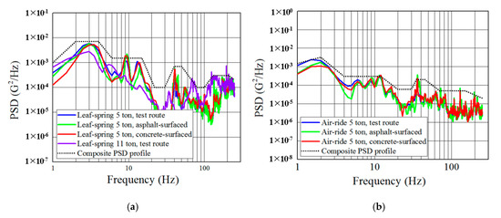 Recommended high-level composite PSD profile representing the top 30% of the data recorded in truck transport (a) leaf-spring truck (b) air-ride truck.