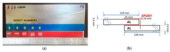 Single lap joint containing double-sided release film debonding: (a) prior to bonding top view photo where the right side is perfectly bonded and the left side is with debonding; (b) side view schematics.