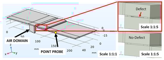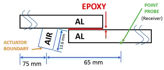 Here the defect is considered as a void where a rectangular portion of the epoxy is removed to simulate the artificial debonding within the structure. The size of the void is 12.7 mm × 0.063 mm. The change in amplitude of the ultrasonic signal will indicate the presence of debonding, and this effect will be compared with the results of the experiment. To avoid boundary reflection, the Rayleigh damping condition was applied to the edge surface of the plate and the radiating boundary condition was applied for the air domain to simulate an infinite acoustic medium.