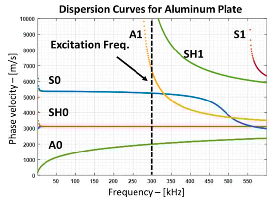 To generate the guided waves in the bonded plate, it is essential to obtain the parameters from the dispersion curves so that the specific modes can be generated. The phase velocity dispersion curves for 1.6 mm thick aluminium 2024 plate were obtained by a semi-analytical finite element (SAFE) method developed in Ultrasound Institute, Kaunas, is shown in Figure 6. To reduce the complexity of the investigation, fundamental modes are preferred. Specifically, A0 mode was selected because it has high out-of-plane displacement when compared to the symmetric S0 mode. Since air is the coupling medium, the incidence angle of 10.84° to generate A0 mode at 300 kHz was calculated using Snell’s law assuming the velocity of sound in air is 343.21 m/s and the phase velocity of A0 mode at 300 kHz is 1824 m/s.
