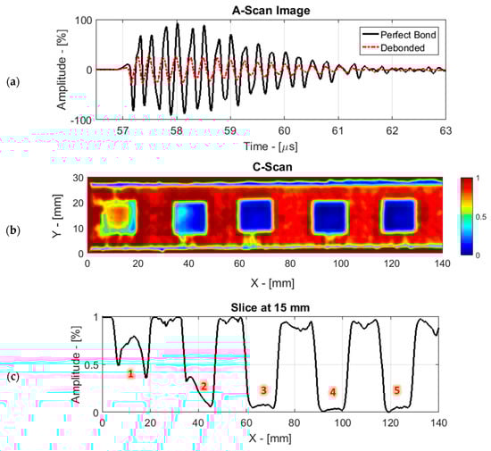 Through-transmission immersion ultrasonic testing with bulk wave results are shown in Figure 11. The A-scans indicate where there is debonding—the ultrasonic bulk wave transmission to the receiver is significantly reduced (Figure 11a). While C-scan results mostly agree with the A-scans, it can be observed that the defect at the far left (defect number 1) is not as consistent as the other defects (Figure 11b). The slice in the middle of the bondline shows normalized amplitude change where there is debonding and no debonding.