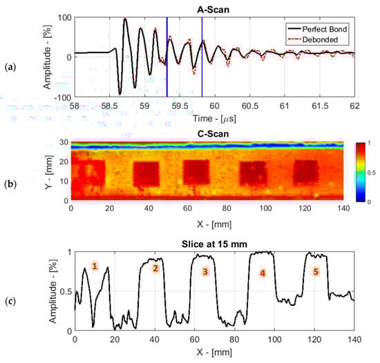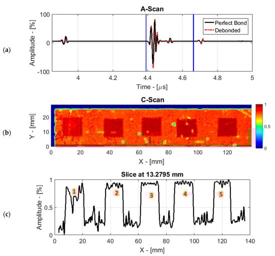 Scanning acoustic microscopy (SAM) results for debonded sample: (a) A-scan; (b) C-scan; (c) slice from the middle of the defects.