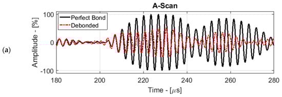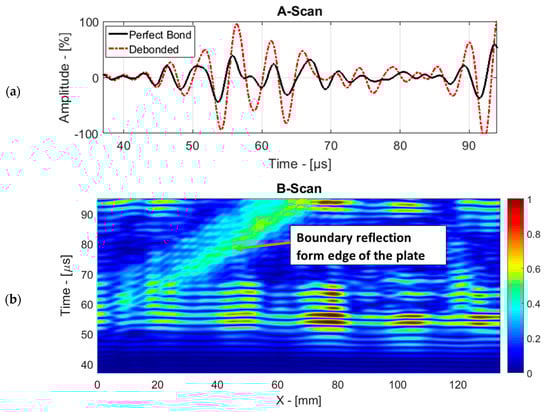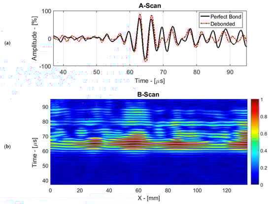 The scanning parameters were the same as that of the air-coupled to contact the GW method. However, in this case, since two contact transducers were used the transmission efficiency is higher in comparison to air-coupled transducers. Thus, the used static gain was 25 dB, and the dynamic gain was 10 dB. The A-scan and B-scan of the experiment with contact-to-contact transducers GW is shown in Figure 19a,b, respectively. The results in this method can be interpreted in a similar way to the results of the air-coupled to contact GW because the amplitude of the GW increases when it passes through the debonded region due to the constructive interference.