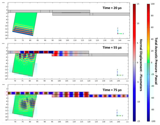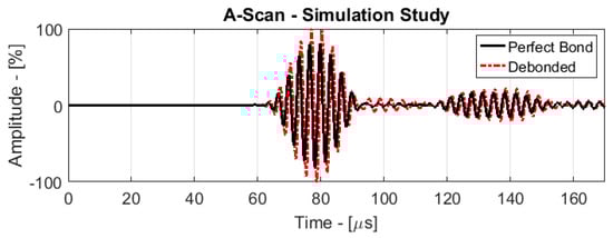 The simulation was performed to understand the constructive and destructive interference of the guided waves in the bonding region and to visualize the spatial distributions in the debonded region in order to understand what to expect in the experimental investigation. The snapshots of the normal distribution along the plane of symmetry at different time frames are shown in Figure 15 where propagation of only A0 mode is evident. In Figure 16a,b, the spatial distributions of the normal displacement for two cases are shown in the left and the middle at 75 µs where visually the two cases are almost indistinguishable. Thus, the differential image (Figure 16c) was obtained by taking a difference between the reference case without defect and the case with the defect at 75 µs. The differential image plot shows the area, which is most suitable to record the signals to obtain maximum information about the defect. The experimental parameters are selected based on these results. The A-scan results from the case with debonding and case with the perfect bond are shown in Figure 17. The results show that the guided waves in the debonded joint show a higher amplitude than the perfect bond. The results are likely to be caused by the splitting of guided waves in the debonded region, causing constructive interference after the waves have crossed the debonded region.