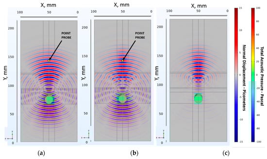 The mesh size considered in each domain is according to the wavelength of each material at 300 kHz and the criteria of eight elements per wavelength was used. The second-order discretization (quadratic discretization) was used for elements. Hence, the following mesh sizes were considered: for air = 0.28601 mm, for Aluminium = 1.52 mm. The time step is calculated according to the Courant-Friedrichs-Lewy (CFL) criteria [29] for the slowest velocity in the simulation, which in this model is for air—343.21 m/s. Hence, the calculated time step is determined to be 8.33 nanoseconds. The total time of 170 µs was recorded. The computer used for the simulation has the configuration: Intel i7-3820 quad-core processor @ 3.60 GHz and 56 GB of RAM.