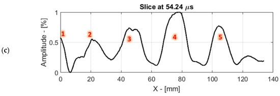 The A-scan and B-scan of this experiment is shown in Figure 18a and Figure 18b, respectively. In the B-scan, the normalized absolute values are shown where the increase in amplitude means that there is a presence of debonding while the lower values represent the place where there is no debonding (perfect bond). This kind of increase in amplitude when GW is passing through the bond is also observed in the simulation. This can be visualized from the A-scans as shown in Figure 18a. Along the B-scan, a slice at the time instant 62.84 µs is shown in Figure 18c, where it represents the damage profile along the scanning distance.