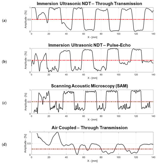 Additionally, ultrasonic NDT techniques have been compared, according to defect sizing performances. For each NDT technique, the decibel drop method had been employed to determine the size of the defects (Figure 20) [30]. According to this technique, a slice with normalized amplitude from the observed C-scan or B-scan is crossed with a horizontal line at the desired decibel drop. For immersion ultrasonic NDT and scanning acoustic microscopy (SAM) results, the slice has been selected in the middle of the defects. The slice selections in air-coupled through-transmission C-scan and guided wave B-scans are performed according to the highest contrast observed. The defect size has been calculated with the −6 dB drop method except for air-coupled through-transmission NDT technique where the drop line is selected at −12 dB. The calculated defect sizes are reported in Table 3. Moreover, the relative errors have been estimated according to the known defect size (12.7 mm). It can be observed that the immersion techniques and SAM can size the defects with higher precision than the air-coupled and contact techniques. Compared to the guided wave inspections, the air-coupled through-transmission method shows higher accuracy of defect sizing. In-between guided wave techniques, the contact-to-contact method determines defect size better than the air-coupled to contact method. However, it is observed that the guided wave contact-to-contact method has high variation in defect sizing for different defects: while defect number 3 has been sized with less than 1% error, others show more than 20% relative error.