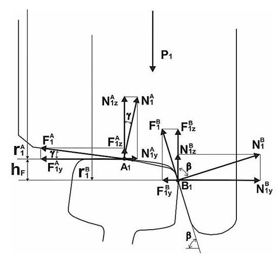 We assume, the wheel flange contacts the side edge of the rail head at a point located under the main contact level (point A1) by the value hF (hF = 8 ÷ 10 mm) and toward in the direction of motion (so-called “angle to attack”) at the distance XF (XF = 1 ÷ 3 mm).