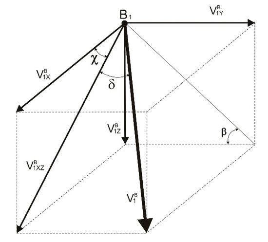 The angle χ between the projection of the slippage velocity vector in the center of the flange contact B1 on the plane xoz in the coordinate system associated with the wheel and the horizontal axis can be determined using the following relation (Figure 1):