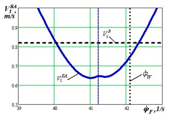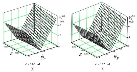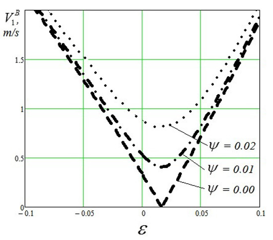 Considering the values , ε and , we get the value and its possible changes can be neglected. It means, that in the given mode of the wheel rotation with the perspective wheel design, there is a possibility of the absence of the kinematic slip in the flange contact, i.e., the velocity m/s and it can happen for ψ = 0.00 rad and