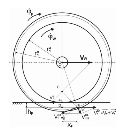 For determining the direction of the velocity vector , it is necessary to take into account that the guiding surface of the wheel (flange) participates in a complex movement together with the wheel tread surface of the wheel. The carrying velocity at the center of the flange contact point B1 will be .