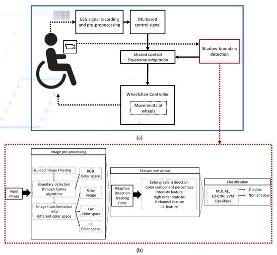 Brain-Machine Interface (BMI) is a digital communication interface capable of connecting cortical activity and an external device, avoiding the participation of peripheral nerves or the muscolar system [1,2]. Hence, in neural rehabilitation research field, BMI technology can be of great help especially for people with neuromuscular disorders, e.g., Amotrophy Lateral Sclerosis (ALS), that are not able to move on their own and require assistance to move with wheelchair. However, it is to be noted that, in real environments, during the navigation with wheelchair, subjects can encounter obstacles that can jeoparde their safety. In this context, motivated by the growing demand to develop even more intelligent assistive navigation systems, we propose a BMI prototype able to aid people with neuromotor disabilities and control a wheelchair using motor imaginary and recent advances in boundary objects detection. Specifically, brain signals are recorded via Electroencephalography (EEG) [2] while the subject is asked to execute specific metal tasks, subsequently decoded to move the wheels. Furthermore, the overall system includes a novel shadow boundary detection algorithm intended to identify possible obstacles and prevent the user from dangerous situations. The mental control signal and the shadow detection algorithm work contextually, according to a shared control logic. When a potential obstacle is detected by the shadow detection algorithm, the system bypasses metal control and actives the safety procedure by stopping or changing the direction of wheels, avoiding the navigation of wheelchair through the shadow of the obstacle identified. Such shared strategy is possible due to the delay existing between the execution of the metal task (e.g., moving the left hand) and its decoding into the specific directional command (e.g., turn left). Indeed, the shared control module works in this time frame. However, it is to be noted that the present paper focuses on the development of the shadow boudary detection module. Shadows in scenes are the most common cause of problems in many computer vision tasks [3,4,5]. Specifically, the existence of shadow can reduce the information of the target or even lead to failure of object recognition, object tracking, image segmentation and so on, on account of the shadow changing light intensity, color and even texture of the objects. Hence, detecting and removing shadows can improve the effectiveness of recognizing and tracking objects significantly. It is also worth investigating potential benefits of shadow: for example, it allows to know shape, size or even movement of objects in an image [6,7] or improve the reality of virtual environments [8]. Features such as intensity, color, texture have been widely used to develop systems able to detect different kinds of shadows [9,10,11]. In the last few decades, Machine Learning (ML) has gained a great deal of attention in several research fields [12,13,14,15], including object detection, object tracking or object recognition [16,17,18,19]. In this context, we propose a ML-based framework to automatically detect shaded areas. The proposed approach is based on a novel filter able to adapt itself with changes in direction of object boundaries and on the extraction of optical and statistical features of the shadow under analysis. The extracted features are used as input to Multilayer Perceptron (MLP), Autoencoder (AE), 1D-Convolutional Neural Network (1D-CNN) and Support Vector Machine (SVM) classifiers to perform a binary pixel-based classification task: shadow vs. non-shadow.