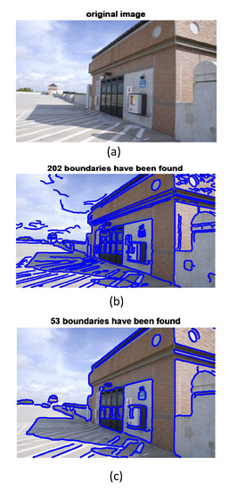 The original RGB image is sharpened to overcome blurring effect (introduced by cameras) and emphasize edge contrast to increase legibility. Using guided-filter [44], users can strengthen the edges and reduce the noise from image. The boundaries of objects are then selected with the canny edge detection method [45]. The threshold parameter and standard deviation in canny edge detection are also calibrated to find an optimal result able to further reduce the feature extraction. As an example, canny detection is applied after guided-filter to the original image shown in Figure 2a. It is worth mentioning that, using the default values of parameters results in 202 boundaries (Figure 2b), while setting the two threshold parameters to 0.08, 0.2 and standard deviation = 3 leads to a reduced number of shadow boundaries (Figure 2c). Hence, in this study, we use this optimized set of parameters. Finally, the RGB image is converted into three color spaces: Gray, LAB and ILL for further investigating the features of shadow [46].