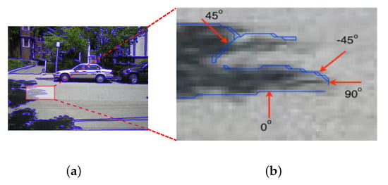 (a) Boundaries detected with threshold values of 0.08, 0.2 and standard deviation of the Gaussian filter = 3. As an example, the red rectangle indicates an area of interest which shows four directions of boundaries. (b) Shadow boundaries with four possible directions for the local region of interest.