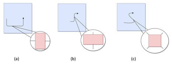 Shapes of ADT filter: (a) filter in horizontal direction (b) filter in vertical direction (c) or − filter in diagonal directions. The blue squares indicate the input images and the arrows in blue square indicate the boundaries found by canny method. The pink quadrilaterals indicate the shape of filters. Rectangle filter refers to horizontal and vertical direction, square filter refers to sloped direction.