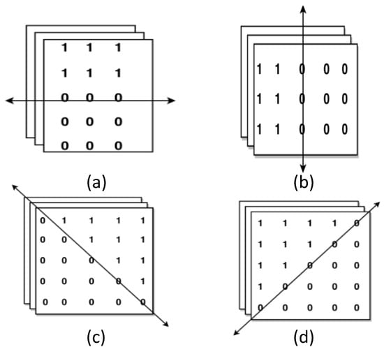 The ADT filter is developed into a rectangle or a square shape, in accordance with the following rules. The rectangle ADT filters applied on images are sized × 3 or 3 × , where represents the length of the filter, while square filters are sized × . Furthermore, the ADT filter is designed as shown in Figure 5. Features are evaluated on both sides of each boundary. It is to be noted that each layer of ADT filter shares the same weight coefficients. When the ADT filter moves along the boundary, the information of the extracted feature will be automatically collected from one side of the boundary through the positive parts with values of 1, such as the upper part of filter in Figure 5a. The same operation is performed to collect information on the other side of the boundary by rotating the filter by 180∘.
