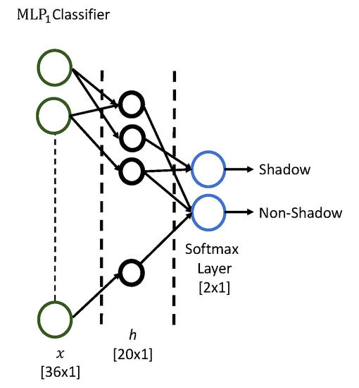 MLP classifier: MLP is the most common feed-forward neural network, that uses standard gradient backpropagation method [52] to minimize the difference between the estimated and target values. It typically consists of one input layer, one output layer and one or more hidden layers [53]. Here, three MLP models are developed: MLP1 composed of 1 hidden layer with 20 hidden neurons; MLP2 composed of 1 hidden layer with 10 units; MLP3 composed of 2 hidden layers with 20 and 10 neurons, respectively. All the developed networks are trained for about 103 epochs on a laptop with a 3.1 GHz Intel Core i5 processor with 8GB memory installed. Note that the saturating linear transfer function is used as activation (since it provided good classification results) and that all MLP models end with a softmax output layer for performing the binary classification task (shadow vs. non-shadow). As an example, Figure 7 shows the MLP1 architecture.