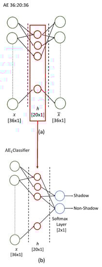 where , , are the corresponding activation function, weight matrix, bias in the decoder module. In this study, for fair comparison, three AE, denoted as AE1, AE2, AE3 with similar topology of MLP1, MLP2, MLP3, respectively are developed. For example, AE1 (whose architecture is 36:20:36, Figure 8a) extracts 20 features (from the 36-dimensional input vector) used as input to softmax layer (trained in supervised modality) to perform the 2-way classification. Next, fine-tuning technique is applied by training again the whole network depicted in Figure 8b and sized 36:20:2. Similarly, AE2 and AE3 were developed. Note that all AE classifiers used saturating linear transfer activation function and were trained for about 103 epochs.