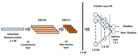 1D-CNN classifier: CNN is a deep learning architecture typically used in 2D-image classification or pattern recognition [55,56,57,58,59,60]. However, 1D-CNN is also employed to process 1D-patterns for discrimination purposes [61]. A common CNN includes different processing layers of convolution, activation, pooling, followed by a feed-forward MLP with softmax output layer. Notably, the first layer is composed of a set of S filters that computes the dot product with a local input region selected by the filter. Every filter moves with a step size s, performing the convolution operation. S features maps are produced. The second layer is typically a rectified linear unit (ReLU) f(x) = max (x,0), employed for its effectiveness, simplicity and also because it provides non upper-bounded output values. The third layer performs the pooling operation. In particular, a filter moves along the input features maps (extracted by the previous layer) and estimates the maximum or average value. The output is a downsampled representation od the input data. It is to be noted that, here, the max pooling operation is used for its good translational-invariant properties [62]. Finally, a fully connected MLP performs the discrimination task. Further details are reported in [63]. In this study, the proposed 1D-CNN is composed of 1 convolutional layer (followed by a ReLU activation function), 1 max pooling layer and MLP for classification purposes (Figure 9). Specifically, the proposed CNN is modelled to receive as input the extracted features vector sized 1 × 36. The convolutional layer is composed of 4 1-dimensional filters sized 1 × 3, stride s = 1 and padding p = 0, resulting in 4 features vectors sized 1 × 34. After applying the ReLU transfer function, the max-pooling, composed of a filter sized 1 × 2 and step size 2, reduces the input spatial resolution from 1 × 34 to 1 × 17. Next, the 4 features vectors are reshaped into a single 1-dimensional vector of dimension 1 × 68 and fed into a 2-hidden layers neural network (with 50 and 10 hidden units, respectively) followed by a softmax output layer for the 2-way pixel-based classification task: shadow vs. non-shadow. The proposed 1D-CNN was trained with stochastic gradient descent optimizer with learning rate of 0.1 for about 103 iterations until the cross-entropy function converged. It is to be noted that the topology of the proposed 1D-CNN was set-up by using a trial-and-error approach. Here, we reported the configuration that showed the best results.