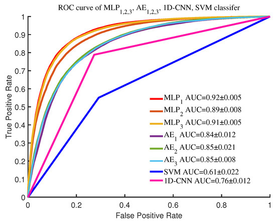 ROC curves of the proposed MLP, AE, 1D-CNN, SVM classifiers. Note that the MLP1 achieved the highest AUC = 0.92 ± 0.005.