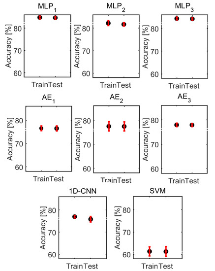 where TP, FP, TN, FN represent the true positive, false positive, true negative and false negative, respectively. Furthermore, the k-fold cross validation (with k = 7) procedure was also applied for quantifying the discrimination performance. In particular, for each class, train set consisted of 70% of instances and test set of remaining 30%. Hence, all evaluation performance are reported as average value ± standard deviation. It is worth noting that the proposed MLP/SVM/CNN are supervised learning approaches and use the class label information in the training procedure. In contrast, AE is trained with unsupervised learning, hence the label was not used during the training phase. The extracted features from unlabeled data were the input to a softmax layer for classification purposes. The whole network is then fine-tuned to enhance performance.