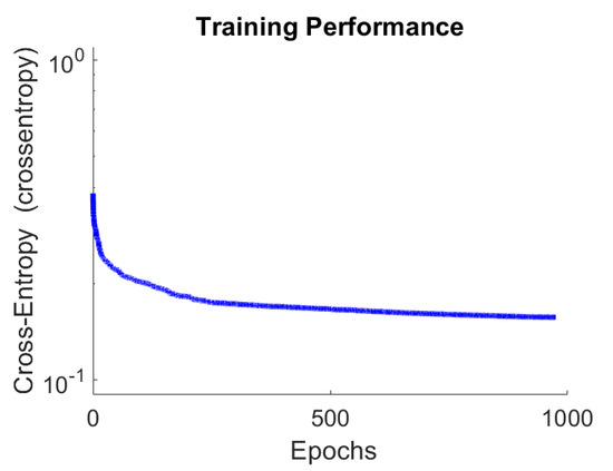 Table 1 reports the pixel detection performance (evaluated on test sets) in terms of averaged precision, recall, F-measure, accuracy for the MLP, AE, 1D-CNN and SVM classifier. In relation to MLP classifiers, MLP1 outperformed MLP2 and MLP3, achieving F-measure and accuracy values of 85.05 ± 0.57% and 84.63 ± 0.63% respectively. However, it is to be noted that high performance were observed also with MLP2 (F-measure of 82.39 ± 0.69%, accuracy of 81.71 ± 0.77%) and MLP3 (F-measure of 84.55 ± 0.53%, accuracy of 84.19 ± 0.56%). In relation to AE classifiers, the model with two hidden layer denoted as AE3, produced F-measure and accuracy rates up to 78.84 ± 0.66% and 77.91 ± 0.72%, respectively. Very good results were achieved also by AE1 and AE2. In particular, the average accuracies were of 76.51 ± 1.04% and 77.51 ± 1.89%, respectively. As regards the proposed 1D-CNN (Figure 9) the following average perfomance were achieved: accuracy of 75.8 ± 1.2%, precision of 73.5 ± 1.91%, recall of 81.0 ± 2.3% and F-measure of 76.9 ± 1%. Finally, as regards SVM classifier, lower average performance were achieved: precision of 62.5 ± 3.88%, recall of 58.6 ± 9.64%, F-measure 59.93 ± 3.85%, accuracy of 61.27 ± 2.18%. Hence, comparative simulation results showed that the proposed MLP1 classifier achieved the highest pixel-based detection performance (accuracy of 84.63 ± 0.63%) as compared to MLP2, MLP3, AE1, AE2, AE3, SVM classifiers. In support of this result, the Area Under the Curve (AUC) of the Receiver Operating Characteristic (ROC) was estimated. Specifically, Figure 10 shows the average values of AUC and related ROC curves, evaluated for the developed MLP, AE, 1D-CNN, SVM classifiers. As can be seen, MLP1 outperformed all the other approaches reporting an AUC = 92 ± 0.53%. It is worth noting that, overtraining and overfitting issues were also studied to assess the effectiveness of the developed models. Specifically, in order to control the aforementioned phenomenon, the k-fold cross validation (k = 7) technique was adopted and train accuracies were also compared with those achieved in the test phase. Note that the following data separation was employed: 70% for train and 30% for test. As can be seen from Figure 11, all the proposed models were not deficient of overtraining or overfitting and provided good generalization abilities, reporting a small standard deviation and a maximum gap between train and test average accuracy of only 1%. Furthermore, networks were trained until the converge of the cross-entropy function was observed. As an example, Figure 12, reports the training phase of the best classifier proposed in this study, i.e., MLP1. However, it is also worth mentioning that the topology of the classifiers, learning and training parameters were set-up performing several experimental tests according to a trial and error approach.