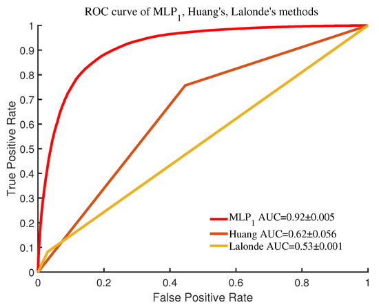 ROC curves of the proposed shadow detection system (i.e., MLP1), Huang’s and Lalonde’s approaches. Note that the MLP1 achieved the highest AUC = 0.92 ± 0.005.