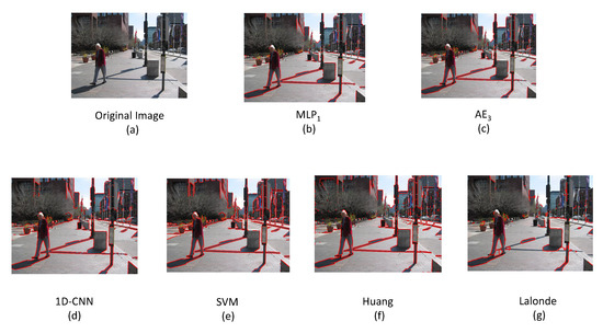 The proposed ADT filter based machine learning shadow boundary detection system was also compared with other approaches reported in the literature. In particular, here Huang’s [9] and Lalonde’s [11] approaches were taken into account. In [9] Huang et al. proposed a physical model of shadow able to compute the width, shape, color of the penumbra and extract some visual features such as shadow sharpness, dark to bright slope, dark to bright ratio and dark to bright gradient used as input to a RBF-based SVM classifier to perform shadow detection task. In [11] Lalonde et al. proposed a decision tree classifier for pixel shadow detection. Specifically, they used a CRF-based optimization to concatenate the shadow pixels to produce a more coherent shadow contour and remove the high unlikely shadow boundaries and isolate weak edges. In contrast, in this study, we propose an ADT filter able to extract HOS and optical features only along the direction of boundary (in simple and complex real scenes) avoiding redundant information [67]. The estimated parameters are then used as input to a very simple and computationally not expensive MLP architecture to perform the 2-way classification task: shadow vs. non-shadow. Furthermore, since Huang’s and Lalonde’s approaches are fully publicly available, for fair comparison we decided also to apply such methods on the same images dataset used in the present study. Comparative experimental results are reported in Table 2. As can be seen, accuracies of 84.63 ± 0.63%, 62.52 ± 5.54% and 52.67 ± 0.1% were achieved by our proposed detection system (i.e. MLP1), Huang’s and Lalonde’s approaches, respectively. Hence, our proposed MLP1 classifier reported the highest performance. Similar result was observed also by evaluating the AUC as reported in Figure 13. As an example, Figure 14 shows the shadow detection results achieved by MLP, AE, 1D-CNN, SVM, Huang’s and Lalonde’s approaches of a realistic scene. Note that only the best MLP and AE classifiers are reported (i.e., MLP1, AE3). As can be seen MLP1 is able to detect shadow boundaries better than other approaches; indeed, 1D-CNN, SVM and Huang’s classifiers detect also buildings and other profiles of the scene that do not belong to a shadow, whereas Lalonde’s is deficient to identify shaded areas. Finally, as previously mentioned, AE3 shows considerable discrimination capability. However, the proposed shadow detection system (i.e., MLP1) has some drawbacks. Features of object boundaries may be similar to those features of shadow boundaries, causing a misclassification of the pixel under analysis. Furthermore, the extracted features are based on physical characteristics, hence, when the intensity of light is weak or when the shadows lie on some special material surface that can cause a significant change of physical properties, the shaded boundary is very difficult to identify. Last limitation is that our proposed system (i.e., MLP1) may include also the object profile in the detection process, as shown in Figure 14b.